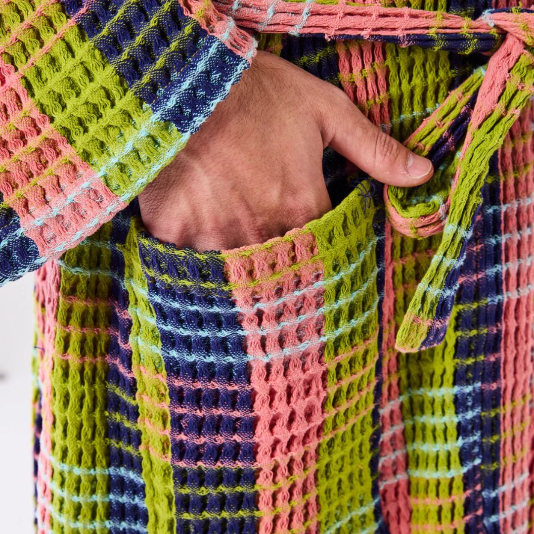 Your everyday holiday starts here! The Florida Tartan Waffle Bath Robe is summery, soft, and perfectly textured for wrapping up after a dip or a long, slow morning. With a comfy tie-waist and generous cut in a melon pink, pear green and navy blue tartan, it’s the ultimate at-home getaway piece.